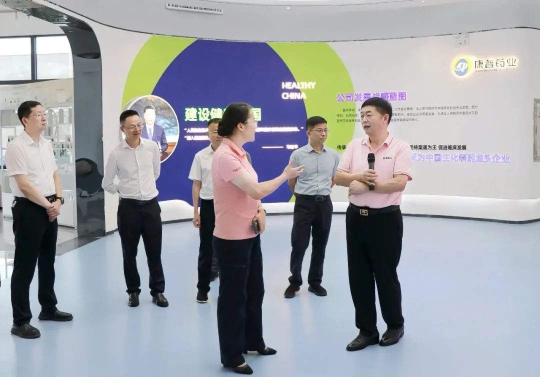 袁世平副市長首先參觀了康普藥業(yè)企業(yè)文化展廳,詳細了解了企業(yè)的發(fā)展歷程,以及在藥品研發(fā)、智能制造、市場營銷等領(lǐng)域取得的顯著成就。曾培安董事長重點介紹了幾款公司在消化系統(tǒng)、心腦血管領(lǐng)域推出的創(chuàng)新藥物。這些產(chǎn)品依托先進研發(fā)技術(shù)和嚴格質(zhì)量體系,贏得市場廣泛認可。袁世平副市長關(guān)切詢問產(chǎn)品研發(fā)細節(jié)與市場前景,并對康普藥業(yè)在研發(fā)創(chuàng)新上的成果給予肯定。